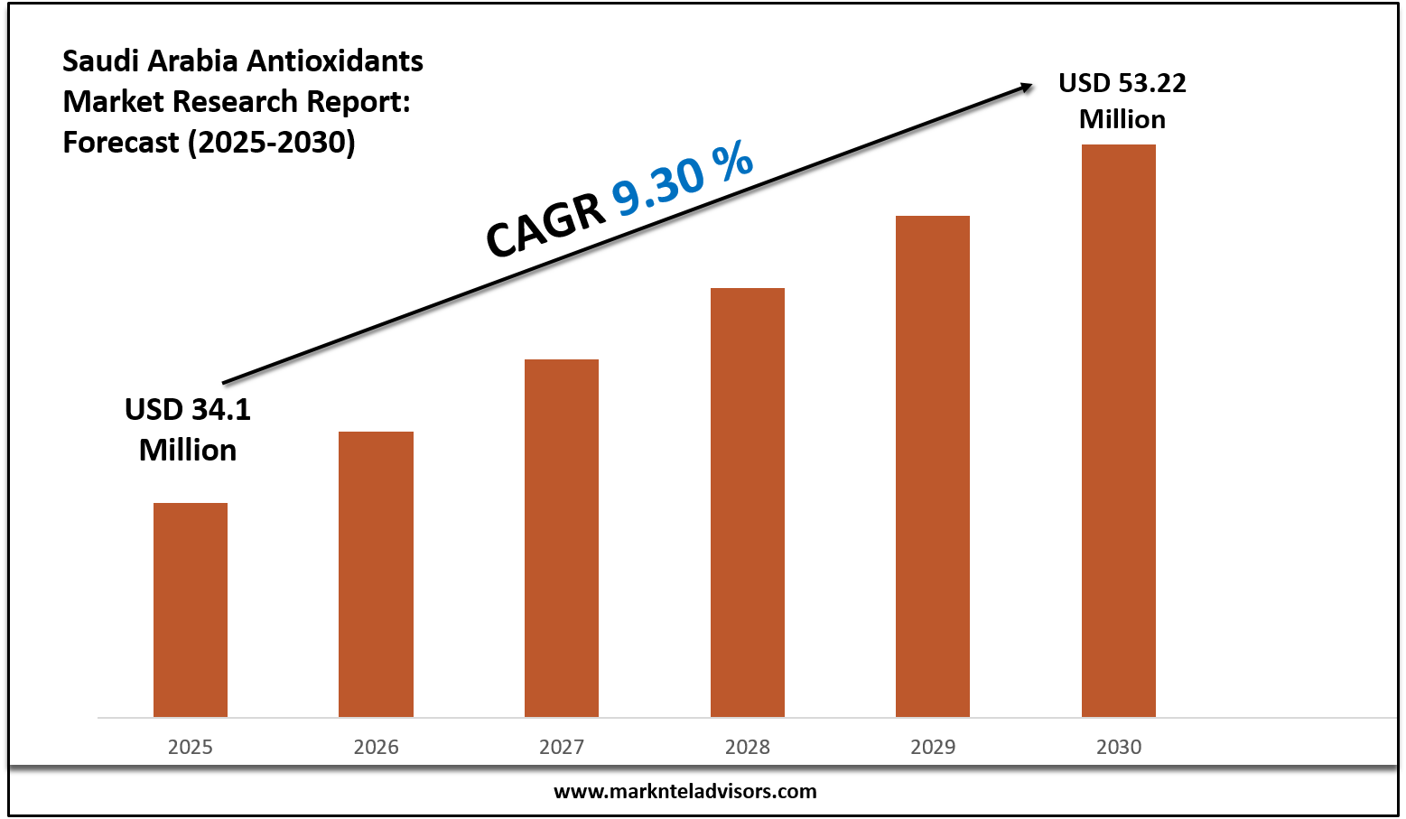 The Saudi Arabia Antioxidants Market is set for remarkable growth, projected to reach USD 53.22 million by 2030 from a base value of USD 34.1 million in 2025, reflecting a compound annual growth rate (CAGR) of 9.30%. This growth trajectory is primarily driven by the increasing demand for nutraceuticals and functional foods to combat oxidative stress and lifestyle diseases, as well as the rising popularity of halal-certified nutricosmetics among health-conscious consumers.